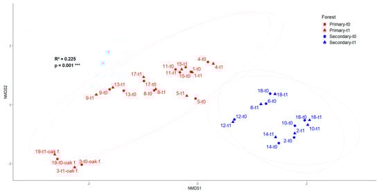 NMDS (Bray–Curtis distances) ordination of the floristic composition of eighteen plots located in Huila, Colombia. oak f. (black oak plots). *** Statistical significance level p ≤ 0.001.