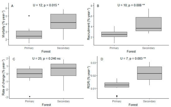 (A) Mortality, (B) recruitment, (C) rate of change, and (D) relative annual growth rate in terms of percent by year for each forest type. U (Mann–Whitney U test), p (p-value). * Statistical significance level p ≤ 0.05. ** Statistical significance level p ≤ 0.01. ns Not significant.