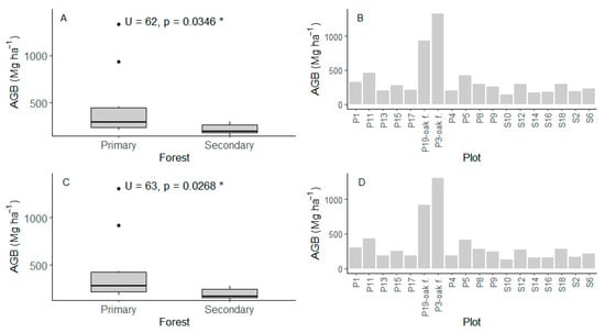 Total aboveground biomass in the re-census for the forests. (A,B) individuals with DBH ≥ 2.5 cm (12–27.7% of the total stems measured). (C,D) individuals with DBH ≥ 10 cm. U (Mann–Whitney U test), p (p-value), P (primary forest), S (secondary forest), oak f. (black oak plots). * Statistical significance level p ≤ 0.05.