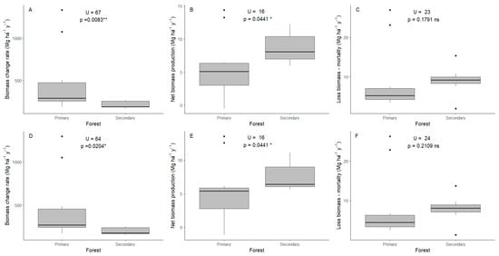 Biomass change rate, biomass production, biomass loss for primary and secondary forests. (A–C) individuals with DBH ≥ 2.5 cm. (D–F) individuals with DBH ≥ 10 cm. (A,D) biomass change rates. (B,E) net biomass production. (C,F) loss of biomass–mortality. U (Mann–Whitney U test), p (p-value). * Statistical significance level p ≤ 0.05. ** Statistical significance level p ≤ 0.01. ns Not significant.