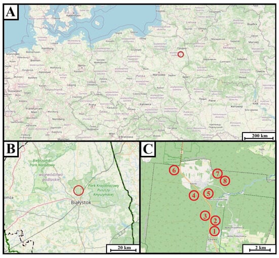 Geographical setting of the survey sites. (A) Position of the Knyszyn Forest study area (red circle) within Central Europe. (B) Location of the study area (red circle) within Podlaskie Voivodeship, northeastern Poland. (C) Detailed map of the Knyszyn Forest showing the eight forest sub-compartments investigated: 1—138a, 2—124D, 3—125D, 4—76G, 5—75G, 6—8I, 7—31f, and 8—7a. Map prepared by Tomasz Pawłowicz; base map data © OpenStreetMap contributors (2025).