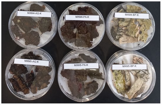 Plant material used for moist-chamber cultures was collected on 10 December 2024. Eight forest sub-compartments were selected, representing three forest associations of high European and global conservation value: Sphagno girgensohnii–Piceetum (corresponding to 91D0* Bog woodland in the Natura 2000 framework and G3.D Boreal bog conifer woodland in the EUNIS system), Ribeso nigri–Alnetum (91E0* Alluvial forests with Alnus glutinosa and Fraxinus excelsior in Natura 2000, EUNIS G1.13 Southern Alnus and Betula galleries), and Fraxino–Alnetum (also 91E0* in Natura 2000, assigned to EUNIS G1.13). Each of these habitat types is recognized as a priority habitat within the Natura 2000 network, underscoring their significance at both European and international levels. Specifically, compartments 124D, 125D, and 138a correspond to Sphagno girgensohnii–Piceetum, compartments 75G and 76G to Ribeso nigri–Alnetum, and compartments 8I, 31f, and 7a to Fraxino–Alnetum (Figure 1C). Three tree species, Alnus glutinosa, Betula pubescens, and Picea abies, served as sources for four types of dead organic matter: wood, bark, fallen leaves, and twigs. From each tree we collected one representative sample of every substrate type. Each sample of 5–10 fragments of bark, dead wood, leaf/needle litter, or fine twigs, was harvested from five spatially distinct micro-sites (1–10 m apart) within the same forest compartment in order to maximize micro-habitat heterogeneity. The fragments were pooled and trimmed to a uniform volume of approximately 60–70 cm3, which is sufficient to cover the base of a sterile polystyrene Petri dish (NOEX, Ø 90 mm × 14.2 mm, aseptic) while still permitting the lid to close hermetically and act as a self-contained moist chamber. In total, 96 such moist-chamber cultures were prepared (Figure 2). Each dish was labelled with the sampling location, date, host tree species, and substrate type, and then transported to the laboratories at the Institute of Forest Sciences, Białystok University of Technology for incubation and subsequent observation.