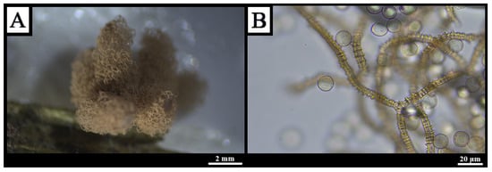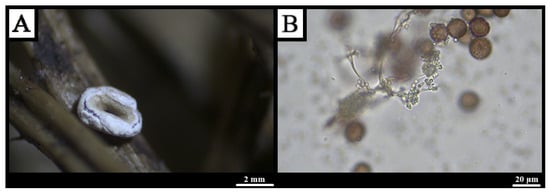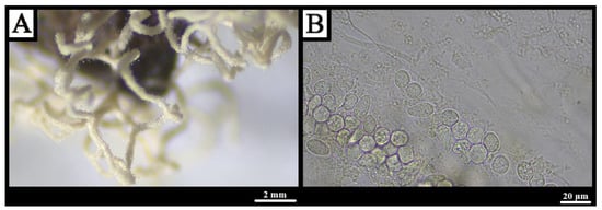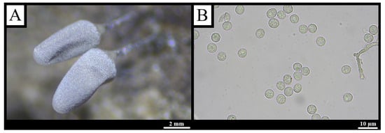 Description: Sporophores arise as droplets on decaying wood, elongating into white, dichotomously branched dendroid columns; basal regions coarsely reticulate, apices smooth and finely granular, sides sheathed by a reticulate layer; tips capped by a perforate membrane with 0.35–0.55 μm calcareous granules (Figure 7A). A colony-wide white hypothallus cracks into irregular fields upon drying. Spores borne singly on stalks 7–20 μm × 1.5–3 μm; spores broadly elliptic to globose, hyaline to faint green-yellow, with granular contents and a basal calcareous granule, 8–15 × 6–10 μm (Figure 7B) [,,].