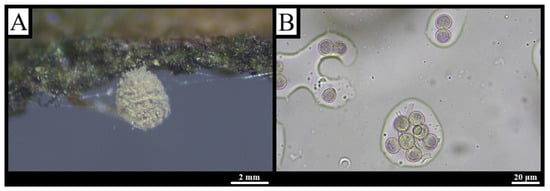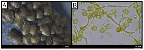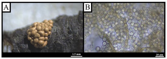 Description: Stipitate sporocarps, scattered to gregarious, globose to broadly ovoid, 0.1–0.5 mm in diameter, 0.3–1.2 mm high when closed, expanding to ca. 1 mm × 2.5 mm; vivid yellow to olive-yellow, maturing pale yellow-brown to dark olive (Figure 4A). A discoid, shining hypothallus is common to adjoining fructifications. Stalk 0.2–0.5 mm, cream to dark brown, packed with spore-like cysts. Peridium fugacious, persisting as an irregular basal disc, yellow-green in transmitted light. Capillitium elastic, with wide irregular meshes; threads 2–6 μm, pale brown-grey to yellow-green, bearing half-rings, rings and scattered warts. Spores yellow to pale yellow in mass, light olive to hyaline in transmitted light, 7–11 μm, uniformly finely warted with occasional larger clusters (Figure 4B) [,].
