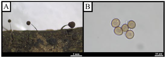 Morphological features of Comatricha nigra. (A) Macroscopic view displaying scattered, long-stalked sporocarps with a dark brown coloration; (B) microscopic observation of dark brown spores bearing fine warts.