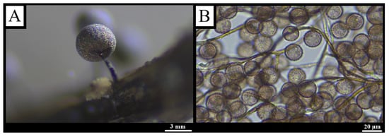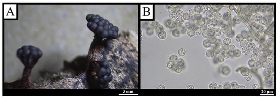 Description: Stalked sporocarps, scattered to gregarious, globose, 0.2–0.6 mm in diameter and 0.5–2 mm tall, iridescent blue to violet-bronze. Disciform hypothallus light to reddish-brown, darker toward the stalk (Figure 11A). Stalk 0.5–1.3 mm, glossy black, indistinctly striate. Peridium delicate, slightly roughened, sometimes with crystalline needles, persisting as collar-like remnants; colorless in transmitted light, apex reddish-brown. Columella cylindrical, reaching mid-sporocarp, dark brown to black. Capillitium a loose, sparsely branched net arising from the columella; threads pale proximally, dark distally, tapering to colorless tips. Spores brown in mass, pale grey-brown in transmitted light, with dark, widely spaced warts, 7–9.5 μm in diameter (Figure 11B) [,,].