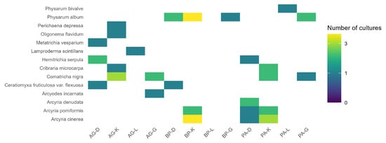Habitat and geographical distribution: Slime mold H. serpula occurred in moist-chamber cultures MXM2-AG-D, MXM3-PA-D, and MXM6-AG-D (Appendix A) established from wood of Alnus glutinosa or Picea abies collected across three distinct sub-compartments of Knyszyn Forest.
