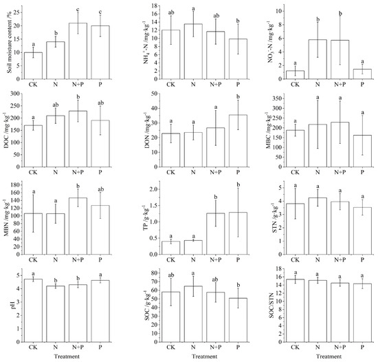 Changes in soil physicochemical properties under N and P addition in a Castanopsis sclerophylla forest in the Anhui Province of China. Treatments are control (CK), nitrogen addition (N), phosphorus addition (P), and co-addition of nitrogen and phosphorus (N + P). Dissolved organic carbon: DOC; dissolved organic nitrogen: DON; microbial biomass carbon: MBC; microbial biomass nitrogen: MBN; soil organic carbon: SOC; soil total nitrogen: STN; total phosphorus: TP; Different lowercase letters indicate significant differences between treatments (p < 0.05). Error bars are standard errors (n = 9).