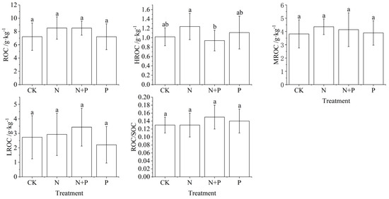 Changes of different active ROC under N and P addition in a Castanopsis sclerophylla forest in the Anhui Province of China. Treatments are control (CK), nitrogen addition (N), phosphorus addition (P), and co-addition of nitrogen and phosphorus (N + P). Reactive oxidized carbon: ROC; high activity readily oxidizable organic carbon: HROC; medium activity readily oxidizable organic carbon: MROC; low activity readily oxidizable organic carbon: LROC; reactive oxidized carbon/soil organic carbon: ROC/SOC; different lowercase letters indicate significant differences between treatments (p < 0.05). Error bars are standard errors (n = 9).
