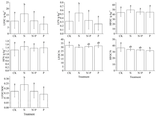 Changes in light and heavy fractions under N and P addition in a Castanopsis sclerophylla forest in the Anhui Province of China. Treatments are control (CK), nitrogen addition (N), phosphorus addition (P), and co-addition of nitrogen and phosphorus (N + P). Light fraction carbon: LFOC; light fraction nitrogen: LFN; heavy fraction carbon: HFOC; heavy fraction nitrogen: HFN; light fraction carbon/nitrogen: LFOC/N; heavy fraction carbon/nitrogen: HFOC/N; light fraction carbon/soil organic carbon: LFOC/SOC; different lowercase letters indicate significant differences between treatments (p < 0.05). Error bars are standard errors (n = 9).