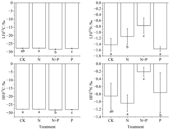 Changes in stable isotope of light and heavy fractions under N and P addition in a Castanopsis sclerophylla forest in the Anhui Province of China. Treatments are control (CK), nitrogen addition (N), phosphorus addition (P), and co-addition of nitrogen and phosphorus (N + P). Light fraction δ13C: LFδ13C; light fraction δ15N: LFδ15N; heavy fraction δ13C: HFδ13C; heavy fraction δ15N: HFδ15N; different lowercase letters indicate significant differences between treatments (p < 0.05). Error bars are standard errors (n = 9).