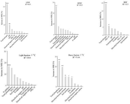 Randomized forests analysis showed that the increase in STN due to N addition which had a significant effect on soil C fractions (LFOC, HFOC, and ROC), while N addition induced significant decrease in pH significantly affected LFOC [52,53]. Significant accumulation of TP promoted by P addition and significant increase in soil moisture under N and P addition had significant effects on light and heavy fraction δ13C abundance (p < 0.05) [54]. Correlation analysis revealed that NH4+-N significantly promoted the accumulation of LFOC, HFOC, ROC, DOC, SOC, while significantly reduced LFOC/N. NO3−-N significantly increased LFOC (p < 0.05). These findings suggest that N-induced enrichment of soil available N contributes to the enhancement of soil C sinks in this region [54]. In addition to directly increasing plant litter production, it has been shown that N enrichment can promote the rate of microbial decomposition of litter by increasing soil moisture and available N, thus promoting SOC inputs [54].