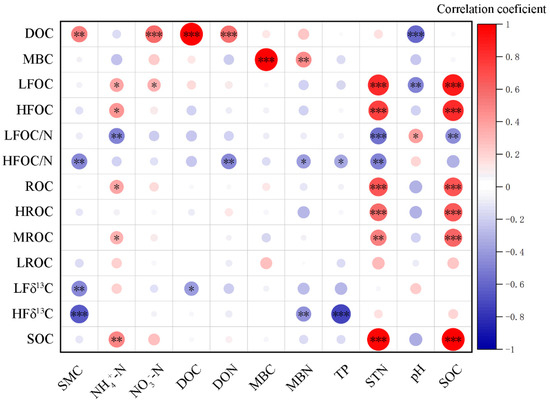 Correlation analysis between soil C fraction and environmental factors in a Castanopsis sclerophylla forest in the Anhui Province of China. Dissolved organic carbon: DOC; microbial biomass carbon: MBC; light fraction carbon: LFOC; heavy fraction carbon: HFOC; light fraction carbon/nitrogen: LFOC/N; heavy fraction carbon/nitrogen: HFOC/N; reactive oxidized carbon: ROC; high activity readily oxidizable organic carbon: HROC; medium activity readily oxidizable organic carbon: MROC; low activity readily oxidizable organic carbon: LROC; light fraction δ13C: LFδ13C; heavy fraction δ13C: HFδ13C; soil organic carbon: SOC; soil moisture content: SMC; dissolved organic nitrogen: DON; microbial biomass nitrogen: MBN; total phosphorus: TP; soil total nitrogen: STN; *: p < 0.05; **: p < 0.01; ***: p < 0.001.