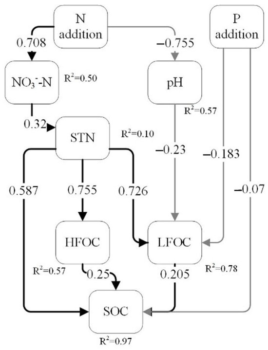 Structural equation model of soil C fraction in a Castanopsis sclerophylla forest in the Anhui Province of China. χ2 = 26.91, p = 0.612, df = 16, CFI = 1, RMSEA = 0, SRMR = 0.08. Nitrogen addition: N addition; phosphorus addition: P addition; heavy fraction carbon: HFOC; soil total nitrogen: STN; light fraction carbon: LFOC; soil organic carbon: SOC. The arrows indicate the hypothesized direction of causality, the numbers on the arrows are standardized path coefficients, the black arrows indicate positive effects, the grey arrows indicate negative effects, and the R2 behind the variable represents the degree to which the model explains the different variables.