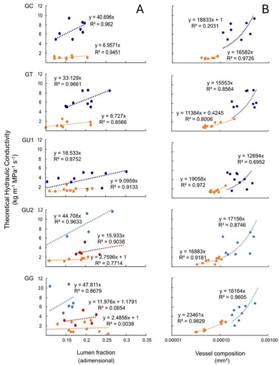 Additionally, the regression slopes of these parameters versus the vessel-related parameter F, which quantifies the lumen fraction at the tissue level, were consistently lower in branches than in stems across all clones (Figure 1A). Although F values were similar between organs within each clone (x-axis of Figure 1; mean values in Table 2 and Table 3), the kstheo was higher in stems than in branches for a given F (Figure 1) across WW and WR plants. However, in clones GG and GU2, the relationship between kstheo and F differed between stems developed under drought and control conditions. For a given lumen fraction and comparable variability, drought-stressed stems exhibited lower kStheo values, as indicated by reduced regression slopes (red lines in Figure 1). Despite F remaining relatively stable or even increasing under drought, kStheo decreased substantially, leading to functional convergence between stressed stems and branches in these clones (Figure 1).