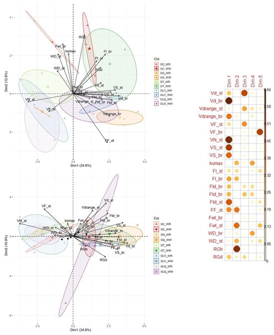 Principal component analysis. Left panels show biplots of PC1 (Dim1) vs. PC2 (Dim2), and PC1 (Dim1) vs. PC3 (Dim3). Right panels display the relative contribution (larger circles and darker color indicate larger contribution) of each trait to the first three principal components (percentages of each contribution are provided in Sections S1–S3). Points represent clone means, with confidence intervals, under well-watered (WW) and water-restricted (WR) conditions. Colors indicate clones: E. grandis (GG), E. grandis × camaldulensis (GC), E. grandis × tereticornis (GT), and E. grandis × urophylla (GU1, GU2). Black diamonds represent the average of each clone irrespective of the irrigation treatment. Vd_st: stem vessel diameter, Vd_br: branch vessel diameter, Vdrange_st: stem vessel diameter range, Vdrange_br: branch vessel diameter range, VF_st: stem vessel lumen fraction, VF_br: branch vessel lumen fraction, VN_st: stem vessel frequency, VS_st: stem hydraulic space index, VS_br: branch hydraulic space index, ksmax: stem specific hydraulic conductivity after embolism removal, Fl_st: stem fiber length, Fl_br: branch fiber length, Fld_br: branch fiber lumen diameter, Ftd_br: branch fiber diameter, Ftd_st: stem fiber diameter, FF_st: stem Fld/Fdt ratio, Fwt_br: branch fiber cell wall thickness, Fwt_st: stem fiber cell wall thickness, WD: branch wood basic density, WD_st: stem wood basic density, RGh: plant height relative growth, RGd: stem diameter relative growth.