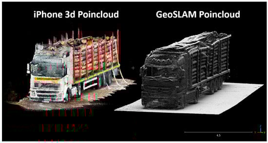 Recent advances in mobile scanning platforms—both professional (e.g., MLS GeoSLAM) and consumer-grade (e.g., iPhone LiDAR)—have opened opportunities for flexible, cost-effective data acquisition in the field [12]. These systems offer varying levels of precision and ease of use, with smartphone-based tools standing out due to their accessibility and intuitive interfaces. By facilitating real-time 3D data collection, they also support rapid feedback loops in logistics and inventory control [29]. Mobile scanners, equipped with advanced LiDAR technology and high-resolution cameras, offer the ability to quickly and accurately capture the geometric details of timber trucks [22,30]. These scanners can be mounted onto vehicles, allowing for on-the-go data collection during timber transportation. Similarly, smartphone-based scanners, some of which leverage LiDAR capabilities [6,12], enable individuals to capture 3D point cloud data, which may prove a cost-effective and accessible solution for truckload measurement. By simplifying and expediting the data acquisition process, these devices may enable real-time monitoring and measurement of truckloads, minimizing delays and optimizing the operational efficiency. The rapid acquisition of high-quality point cloud data is also compatible with the implementation of algorithms for automated measurement, enhancing accuracy and reliability. This way, the integration of mobile and smartphone-based scanners into existing workflows offers a seamless solution that can easily be adopted by forestry professionals and stakeholders [31].