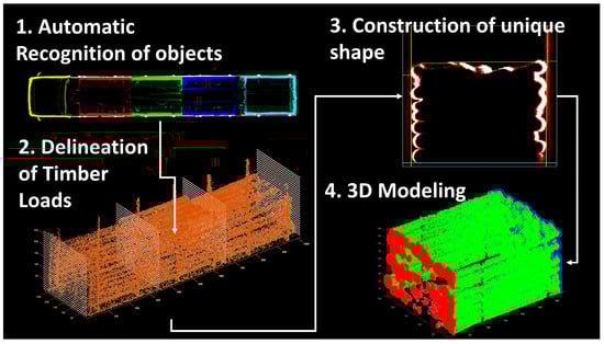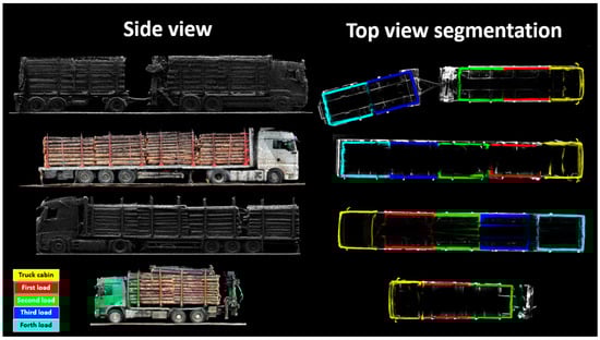 In the first step, the truck has to be extracted from the surrounding details captured in the point clouds, as these details can be very abundant and confusing, especially in LiDAR scenes [32]. The automatic identification is based on the assumption that the truck must be a large object, characterized by some specific geometric features, placed near the center of the scene. The next step consists of properly rearranging the data points through rotation and translation in order to set the ground horizontally and the longitudinal axis of the piles along one of the main horizontal axes. The algorithm continues by recognizing the timber loads extracted by the automatic system. Each load is labeled based on a color rule applied to all trucks. The color rule assigns specific colors to different parts of the truck, such as the cabin, the first load, the second load, the third load, the fourth load, and the fifth load (if present). For example, the cabin may be assigned a yellow color, the first load a red color, the second load a green color, and so on (Figure 2). Color-based recognition enables the algorithm to distinguish and identify the individual timber loads located on the truck.