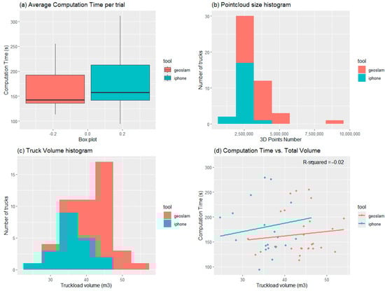 In summary, the analysis suggested that neither the scanning tool, the size of the point cloud, nor the truckload volume significantly affected the computational time. Figure 4a shows the processing time per truckload; Figure 4b,c show the relationship with point count and volume, respectively. This finding implies that the algorithm used for automatic measurement is efficient and robust, as it can handle varying point cloud sizes and truckload volumes without a substantial increase in the computational time.