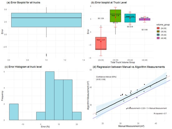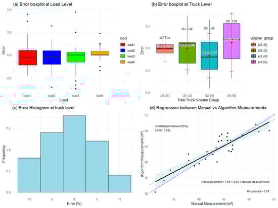 Figure 5 shows high agreement between the automated and manual measurements. Boxplots at the load and truck levels (Figure 5a,b) show low, centered errors with no systematic bias. The error histogram (Figure 5c) indicates that most of the deviations fall within ±5%. The regression plot (Figure 5d) confirms the strong correlation (R2 = 0.79) and alignment with the manual values.