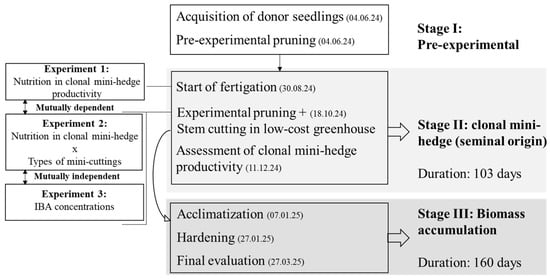 Flowchart illustrating stages of clonal mini-hedge management, mini-cutting rooting, and acclimatization of clonal seedlings of Swietenia macrophylla King.