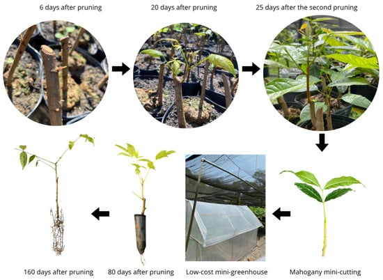 Although recent studies have reported promising results in the clonal propagation of neotropical forest species using mini-cuttings [,,], there remains a need for a more robust theoretical and technical foundation to support the development of efficient protocols for Amazonian species. Overcoming the inherent recalcitrance of many forest species, including Swietenia macrophylla, continues to be a major challenge, as these species often exhibit low responsiveness to vegetative propagation due to limited regeneration and transformation capacities [].