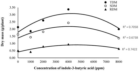 Shoot (SDM), root (RDM) and total dry mass (TDM) linear reduction at higher doses can also be linked to the degree of juvenility of donor plants, to the physiological condition of the propagules, and to the presence of endogenous auxins and rhizogenesis-inducing enzymes like starch phosphorylase, amylases and kinases []. It is worth noticing that juvenile cuttings often present endogenous indole-3-acetic acid (IAA) levels good enough to trigger the rooting process without the need for exogenous auxin application [].