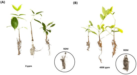 Swietenia macrophylla King clones derived from mini-cuttings treated with different indole-3-butyric acid (IBA) concentrations of (A) 0 ppm and (B) 4000 ppm.
