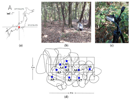 The study was conducted in a broadleaf forest in the Aichi Prefecture Forest Park (468 ha), Nagoya, Japan (35°13′59.4″ N, 137°2′16.2″ E at an altitude of 73.6 m) (Figure 1). The climate in this area is temperate with 1579 mm of mean annual precipitation and 16.2 °C mean annual temperature (based on AMeDAS data from 1991 to 2020 for Nagoya City, which is located 15 km from the study site) [30]. High precipitation occurs from June to September, reaching 1085 mm per month (55%). The area is covered by a 60- to 70-year-old secondary forest consisting of Japanese chinquapin (Castanopsis cuspidata), Itajii chinkapin (Castanopsis sieboldii), blue Japanese oak (Quercus glauca), and bamboo-leaf oak (Quercus myrsinifolia) [31]. Dominant shrub species include Japanese eurya (Eurya japonica), Japanese aralia (Dendropanax trifidus), and Japanese camellia (Camellia japonica). Additionally, autumn fern (Dryopteris erythrosora), Asiatic jasmine (Trachelospermum asiaticum), and dwarf lilyturf (Ophiopogon japonicus var. umbrosus) cover the understory vegetation.