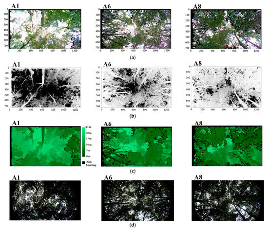 Five-band depth images and corresponding fish-eye images at locations A1, A6, and A8, which represent different measurement locations: (a) visible red, green, blue (RGB) image; (b) near-infrared image; (c) depth image; (d) fish-eye image.