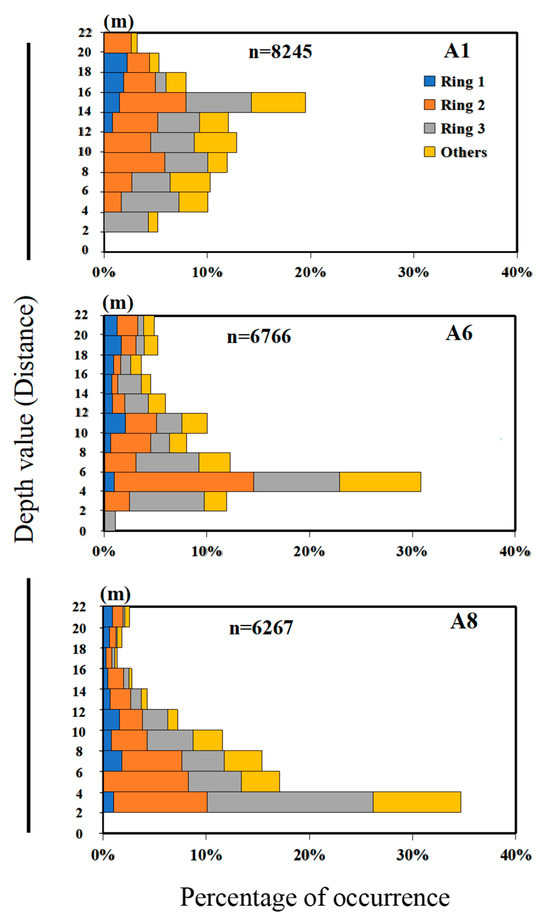Depth information showed distinct variations in vertical canopy structure among locations within rings (Figure 3). At A1 location, the greatest concentration in rings 2 and 3 mainly occurred within the 14 to 16 m height range, with ring 2 and ring 3 each accounting for 6% (Figure 3). Ring 1 in A6 had a relatively homogeneous distribution of height with 4 to 22 m (Total 10%), while each concentration of ring 2 occurred at 4 to 6 m with 14% (Figure 3). At A8 location, the greatest concentration of rings 2 to 3 occurred in the lowest height with 2 to 4 m with 9% in ring 2 and 16% in ring 3 (Figure 3).