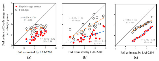 Comparison of plant area index (PAI) estimated by depth image sensor and fish-eye photography with respect to LAI-2200 measurements: (a) PAI from total images; (b) PAI from ring 1; (c) PAI from ring 1 + 2. The blue and yellow dashed lines represent linear regression lines for the depth image sensor and fish-eye photo estimates, respectively.