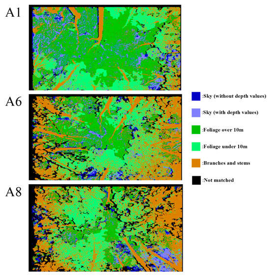 The classification of canopy structures showed the distinctive distribution of foliage above 10 m, foliage below 10 m, and non-assimilating parts (Figure 5 and Figure 6, Table 3). Excluding the sky and non-matching parts for all locations on the three dates, foliage above 10 m ranged from 9 to 48% with 25% of mean values (SD: 0.12), while foliage below 10 m ranged from 12 to 55% with a mean of 32% (SD: 0.10). Non-assimilating parts of all locations on the three dates ranged from 24 to 58%, with 43% of mean values and 0.09 standard deviation (Table 3). At the location of A1, the foliage above 10 m was distributed as major part of the canopy, which consisted of six to seven trunks (non-assimilating parts). Excluding the sky and unclassified parts, the average values across the three dates show that foliage above 10 m in A1 comprised 41% of the total plant leaf area, while foliage below 10 m was 31%, and non-assimilating parts accounted for 28% (Table 3; Figure 5). In A6 and A8, foliage below 10 m was 37 and 40%, with non-assimilating parts being 44% and 47%, respectively (Table 3; Figure 5).
