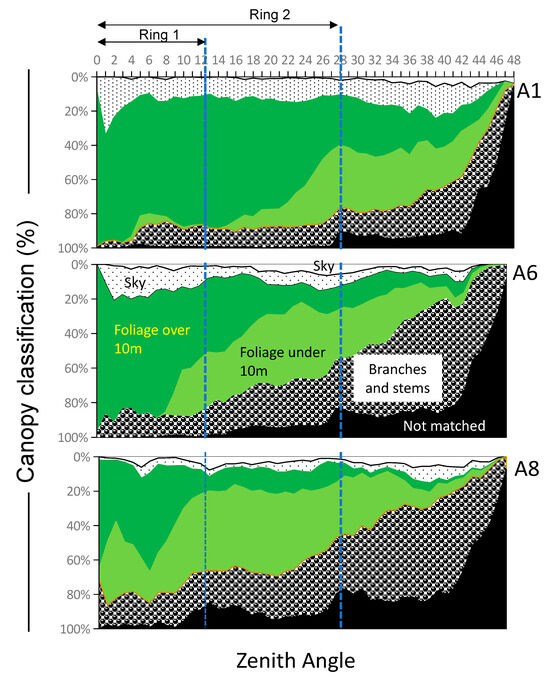 Our classification showed the proportion of coverage rates at different zenith angles (Figure 6). As the zenith angle increases from 0 to 48 degrees, the foliage coverage rate decreases and non-assimilating parts increases, while the patterns differ depending on the canopy structures. For A1, foliage < 10 m increased approximately 25 degrees, and the non-assimilating part started increasing at 35 degrees (Figure 6). For A6 and A8, foliage with >10 m increased from 10 to 15 degrees, while branches and stems increased gradually for the entire zenith angle.