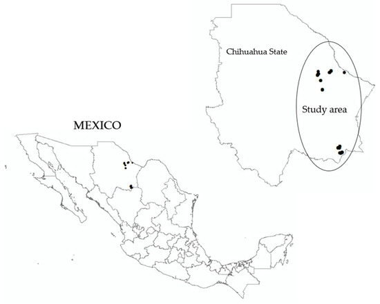 The study was conducted in desert scrubland ecosystems characterized by rosette-forming vegetation, particularly the presence of A. lechuguilla, located in the arid and semi-arid regions of the state of Chihuahua, México (Figure 1). The predominant vegetation includes shrub species such as Euphorbia antisyphilitica Zucc, A. lechuguilla, Lippia graveolens HBK, Larrea tridentata (DC) Coville, and members of the genera Dasylirion and Opuntia [24,45]. The elevation ranges from 700 to 1850 m above sea level, with an average annual precipitation of 250 mm and temperatures ranging from −5 °C in winter to 40 °C in summer [46].