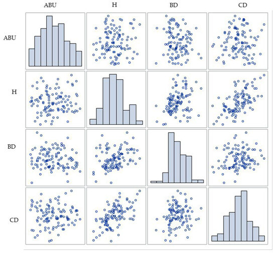 Scatterplot matrix showing bivariate relationships among morphological and abundance variables. Note: ABU = abundance; H = plant height; BD = basal diameter; CD = crown diameter.