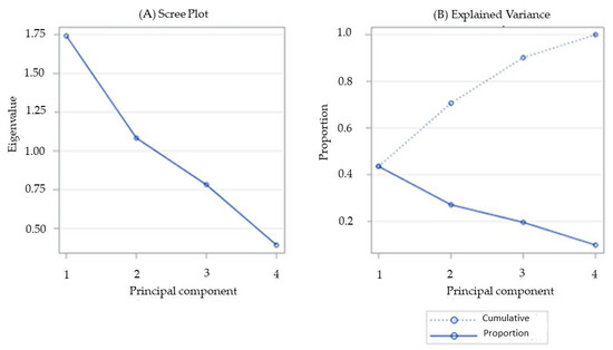 In addition, the PCA results are illustrated in the scree plot and the explained variance plot (Figure 5). This plot shows a sharp decline in the eigenvalues from the first to the second principal component (A), followed by a more gradual decrease, suggesting that the first two components captured most of the variation in the data. The explained variance plot (B) confirms this, indicating that PC1 and PC2 together accounted for approximately 70.63% of the total variance. This supports the selection of the first two components for visualizing multivariate patterns and interpreting the main ecological gradients represented in the dataset.