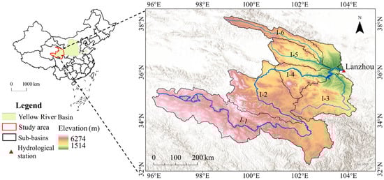 The upper Yellow River Basin (UYRB), located upstream of the Lanzhou hydrological station, spans 95°52′ E–104°12′ E and 32°09′ N–38°17′ N. This region covers an area of 223,000 km2, accounting for approximately 28% of the entire Yellow River Basin [30,36]. Positioned as a transition zone between the northeastern Tibetan Plateau and the Loess Plateau, the UYRB features diverse topography, with elevations ranging from 1514 m to 6274 m and an average elevation of 3634 m. The landscape, dominated by mountains and plateaus, encompasses the Qilian Mountains and is intersected by several river systems, resulting in a complex geomorphic environment. The climate is characterized by cold, dry winters and hot, rainy summers, with approximately 500 mm of annual precipitation occurring mainly during the summer [39]. As a critical runoff source, the UYRB contributes around 60% of the Yellow River’s annual runoff [36], with precipitation being the primary contributor [40]. The study area’s varied soils and vegetation, including grasslands and forests, significantly influence the spatial and temporal dynamics of WY. To facilitate analysis, the UYRB was partitioned into six sub-basins based on the three-tier water-resources zoning framework implemented by the People’s Republic of China, as shown in Figure 1.
