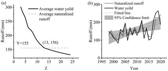 Comparison of simulated annual WY and naturalized runoff. (a) Multi-year average of simulated WY (black line) for different Z values compared with the multi-year average of naturalized runoff (grey dashed line, 155 mm). (b) Simulated WY (black line) versus naturalized runoff (grey line).