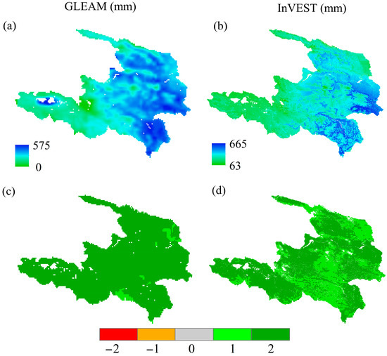 Comparison of actual evapotranspiration obtained from GLEAM and InVEST models; (a,b) show the multi-year average ET; (c,d) present their trends, where −2, −1, 0, 1, and 2 denote significant decreases, nonsignificant decreases, stabilization, nonsignificant increases, and significant increases, respectively.