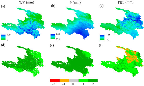 Changes in the multi-year average spatial distribution and trends in WY, precipitation (P), and potential evapotranspiration (PET) (1990–2020). (a–c) Show the spatial distributions of WY, P, and PET, respectively, and (d–f) present their trends, where −2, −1, 0, 1, and 2 denote significant decreases, nonsignificant decreases, stabilization, nonsignificant increases, and significant increases, respectively.