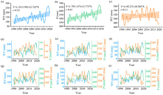 Interannual plots of WY, P, and PET from 1990 to 2020; (a–c) show the line plots of WY, P, and PET (mm) in the upper Yellow River Basin, with shaded areas indicating the 95% confidence intervals; (d–i) present the line plots for sub-basins I-1, I-2, I-3, I-4, I-5, and I-6, respectively.