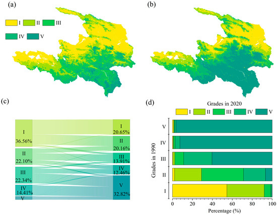 Distribution and transfer of WY classes; (a,b) show the 5-class distributions of WY in 1990 and 2020, respectively, using natural breakpoints; (c) illustrates the transfer of WY classes in 2020 compared to 1990, with numbers indicating the proportion of area occupied by each class; (d) shows the rate of change in the WY structure from 1990 to 2020, with the vertical axis representing the structure in 1990 and the color inside each bar indicating the structure in 2020.