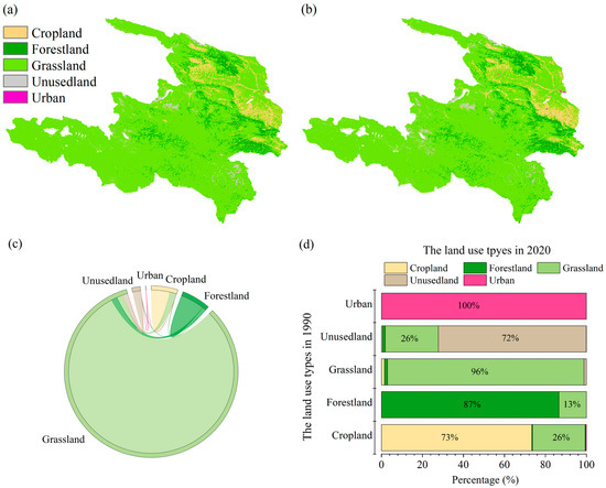 Spatial distribution and transfer of land use; (a,b) show the spatial distributions of land use in 1990 and 2020, respectively; (c) illustrates the transfer of land-use types between 1990 and 2020; (d) displays the structure of land use in 1990 and 2020, with the vertical axis representing land-use types in 1990 and the bar chart indicating the land-use types in 2020.