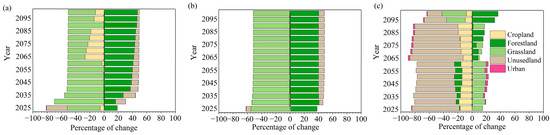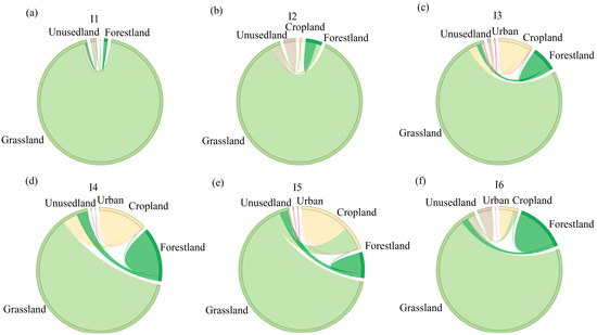 Based on the overall trend in land-use change across the study region, the patterns of land use transformation within each sub-basin exhibit notable spatial heterogeneity (Figure 9a–f). In I-1, grassland dominates the landscape, accounting for 97.4% of the area, with primary conversions to forest land (42.4%) and unused land (57.1%). A substantial proportion of cropland (62.5%) was converted to grassland, indicating a clear trend of cropland abandonment and ecological restoration. In I-2, grassland was primarily transformed into forest land (52.7%) and urban land (21.6%), while only 0.8% of forest land experienced conversion, suggesting a coexistence of afforestation and urban expansion. I-3 exhibited the most intensive ecological restoration, with 89.1% of the grassland converted to forest land. In contrast, I-4 showed pronounced urbanization, with 83.2% of newly developed construction land originating from former cropland and grassland. In I-5, 38.1% of cropland and 51.9% of unused land were transformed into grassland and forest land, respectively, reflecting an emphasis on ecological improvement. In I-6, although grassland was largely retained (97.1%), 66.4% of newly added construction land originated from unused land, indicating a distinct trajectory of urban expansion. Overall, I-1 and I-3 are characterized by land restoration efforts, particularly the conversion of farmland to forest and grassland. I-2 and I-4 exhibit varying degrees of urbanization, while I-5 demonstrates a mixed pattern dominated by ecological restoration. Although I-6 experienced a limited land-use change, the direction of urban expansion is evident. These results highlight substantial spatial heterogeneity and divergence in land-use transition pathways across sub-basins.
