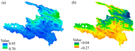 As shown in Figure 5 and Figure 6, P and WY in the UYRB share similar spatial patterns and trends, with a strong interannual correlation of 0.97, while PET shows a negative correlation of −0.57 with WY. Across sub-basins I-1 to I-6, P correlates with WY at 0.97 to 0.98, while PET correlations range from −0.50 to −0.68. Using the sensitivity analysis method (Equations (3) and (4)), the mean sensitivity of WY to P is 0.83 (0.70–0.95), with lower values in zones I-4 and I-5 (Figure 10a). The mean sensitivity of WY to PET is generally low at −0.10 (−0.27 to −0.04), with higher sensitivity observed in zone I-1 (Figure 10b).
