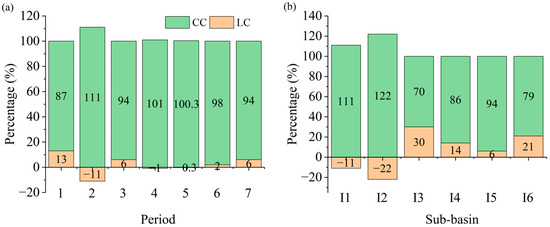 Contribution of climate change (CC) and land-use change (LC). (a) shows the contribution proportions for different periods (1990–1995, 1995–2000, 2000–2005, 2005–2010, 2010–2015, 2015–2020, and the overall 1990–2020 period, representing the average contribution of the preceding years); (b) presents the contributions of climate change and land-use change in each sub-basin from 1990 to 2020.
