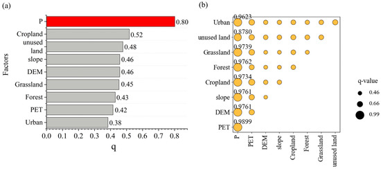 Factor detection results (Figure 12a) revealed that precipitation (P) was the dominant driver (q = 0.80, p < 0.001), followed by cropland (q = 0.52) and unused land (q = 0.48). Topographic variables such as elevation (DEM) and slope also exhibited moderate explanatory power (q = 0.46), highlighting the importance of terrain in modulating water redistribution.