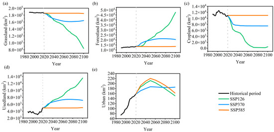 The Land Use Harmonization Database (LUH2), part of the Coupled Model Intercomparison Project Phase 6 (CMIP6), provides annual land-use patterns from 850 to 2100 at a spatial resolution of 0.25° × 0.25°. To ensure compatibility with regional conditions, the LUH2 dataset was calibrated against historical land-use data [46]. First, discrepancies were identified between LUH2 and historical datasets regarding land-use categories and spatial extents in overlapping years, necessitating harmonization to achieve dataset consistency. Both datasets were therefore reclassified into six standardized land-use categories—grassland, cropland, forestland, water bodies, unused land, and urban areas. Since the LUH2 dataset does not reliably project future changes in water body extent, and previous studies have shown minimal impacts of water areas on watershed water yield [28], the water category was excluded from further analysis. Second, future land-use change rates were computed under three distinct scenarios based on the 2020 LUH2 projections. These rates were then applied to historical land-use data from 2020 to project future land-use demands for grassland, cropland, forestland, unused land, and urban areas.