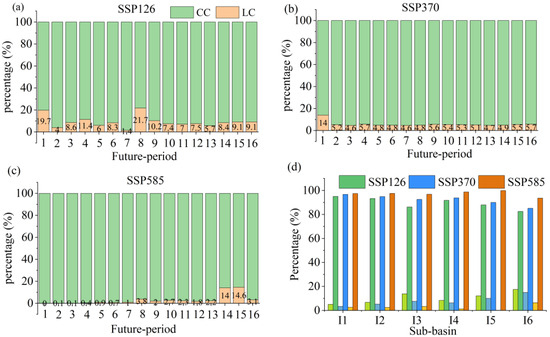 Figure 11a demonstrates that climate change is the dominant factor influencing WY in the UYRB, accounting for an average of 94% over multiple periods, significantly surpassing the contribution of land-use change (6%). This indicates that changes in climatic factors, such as P, have a far greater impact on regional hydrological processes than land-use changes. During the periods 1990–1995, 2000–2005, and 2015–2020, land-use change had a positive but relatively small impact on WY (2%–13%). In contrast, during the periods 1995–2000, 2005–2010, and 2010–2015, land-use change had a negative influence on WY, particularly in 1995–2000, when its contribution was −11%. These results highlight the inconsistent effects of land-use change on WY over different periods. At the sub-basin level (Figure 11b), climate change significantly outweighed land-use change in its contribution across all sub-basins, with climate change contributions ranging from 70% to 122%, further confirming its decisive role in driving WY variations. Sub-basins I-1 and I-2 experienced negative contributions from land-use change (−11% and −22%, respectively), while sub-basins I-3, I-4, I-5, and I-6 saw positive impacts (6%–30%).